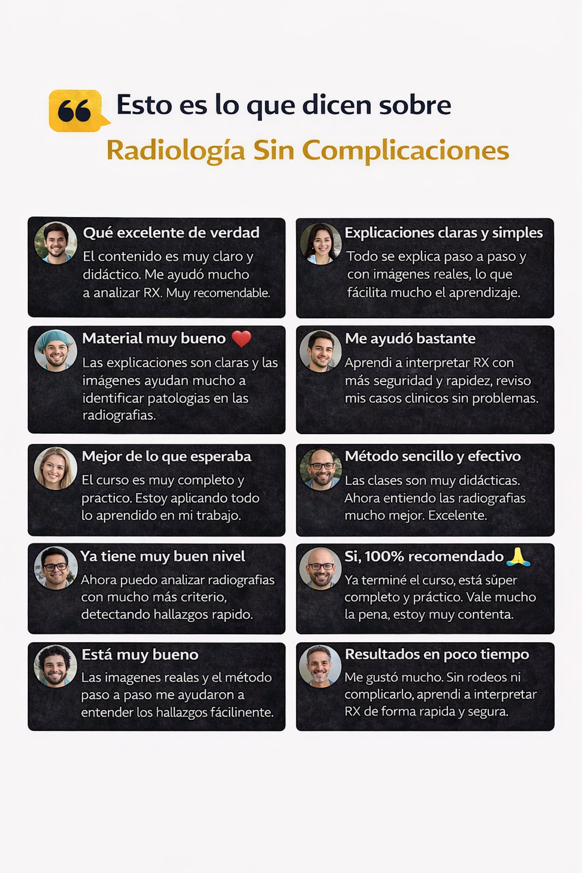 Testimonios reales de personas que ya interpretan radiografías con mayor claridad y confianza gracias a Radiología Sin Complicaciones.